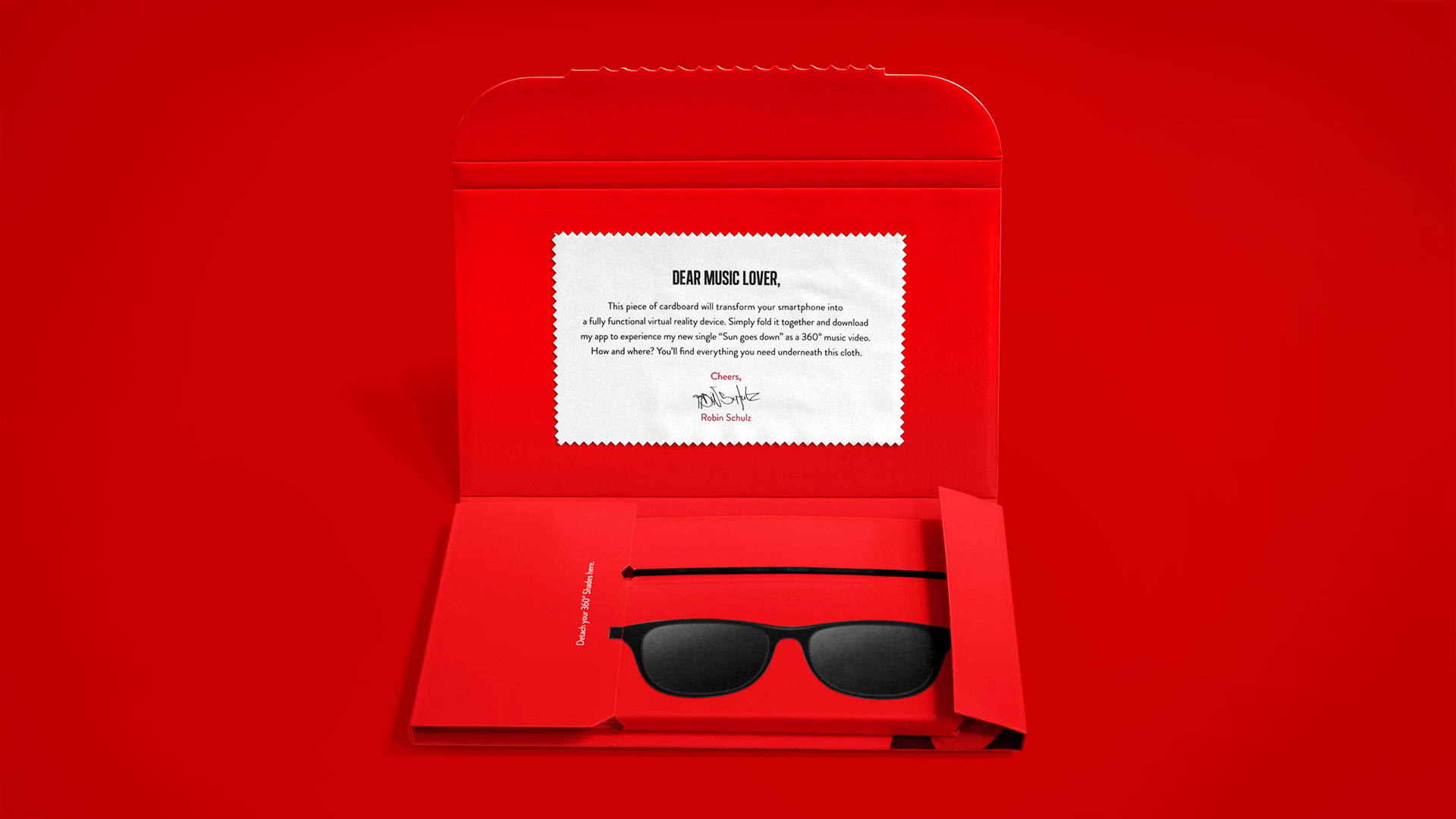 Um Robin Schulz’ neue Single „Sun goes down“ bei Musikentscheiden weltweit zu promoten, wurde sein Markenzeichen – die Sonnenbrille – als einfach faltbare Cardboard-Brille verschickt. Mit ihr konnten die Empfänger den Song als 360° Virtual Reality Music Video erleben.